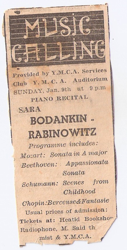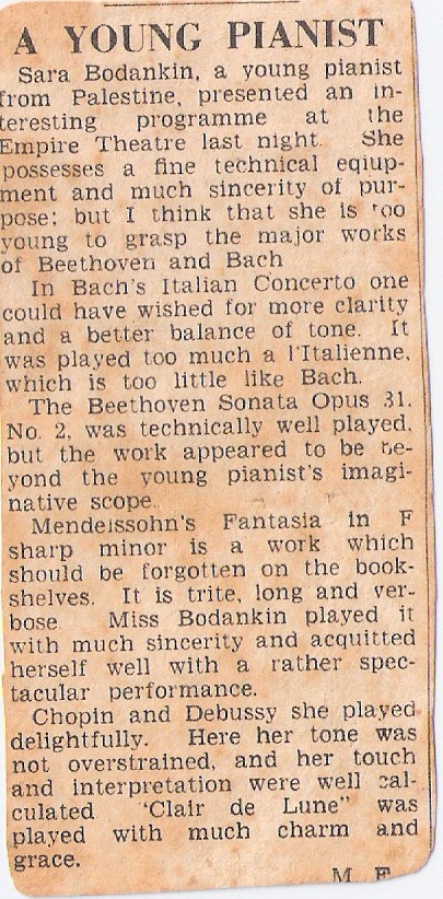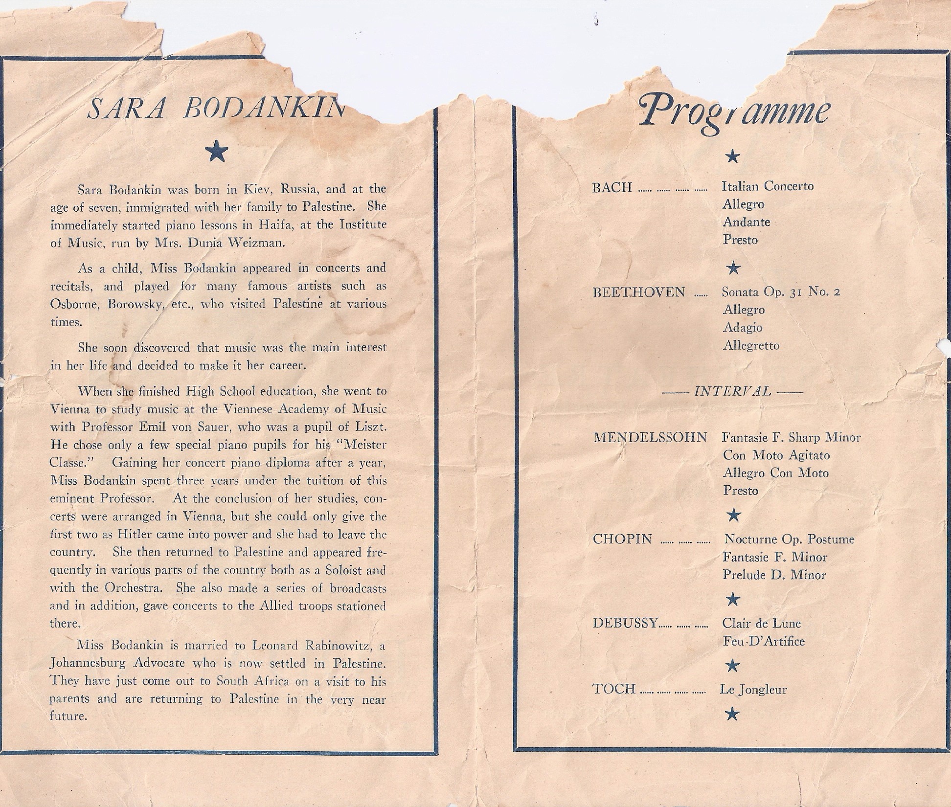 ביקור המשפחה בדרום אפריקה בשנת 1945 נתן לפסנתרנית הצעירה אפשרות להופיע עם תזמורת רשות השידור של דרום אפריקה, וכן ברסיטל ב- EMPIRE THEATRE ביוהנסבורג.