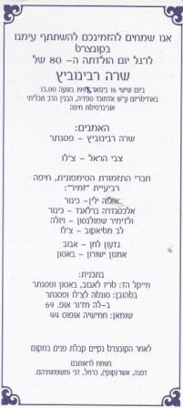 "…Everyone who knew Savta Sara realizes how energetic and vital she is. She is never too tired to do things, to play the piano, to play with the children , to have guests, to talk, discuss and to phylosophize. She is a wonderful pianist, and that we've all heard today. "She is also, as we learned today, a great and dedicated teacher who has influenced generations of students not only by teaching them music but also by inspiring them. Moreover, becoming a spiritual leader in their lives, actually that she is for all of us. more